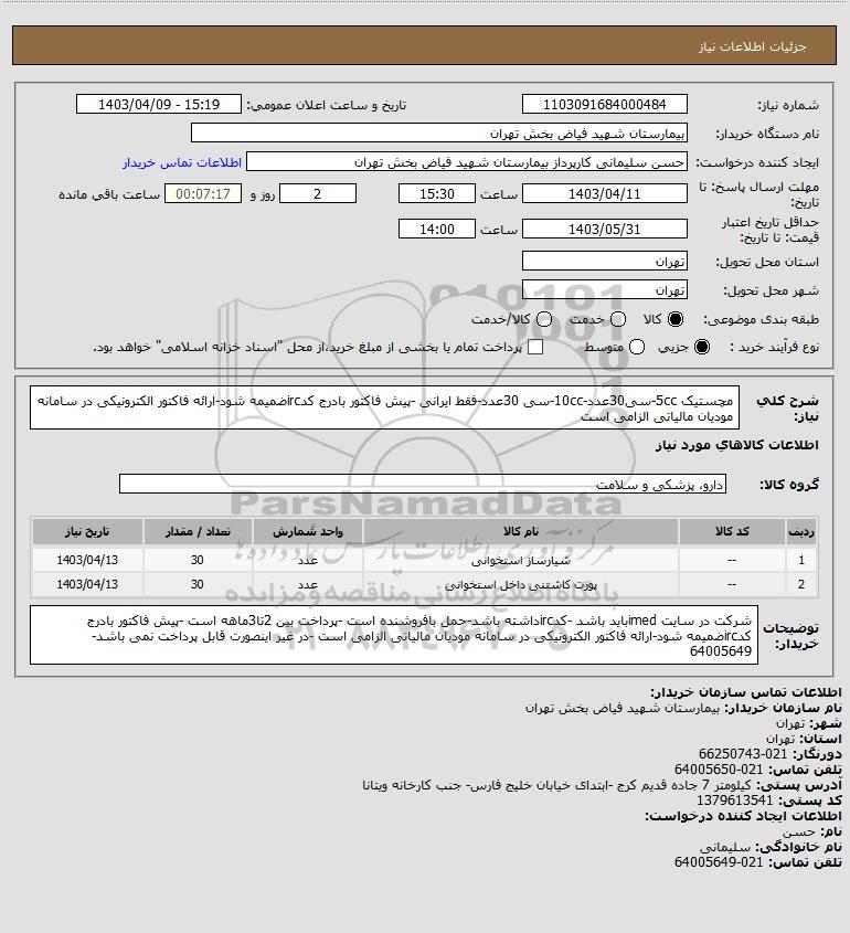 شرح کلی نیاز: مچستیک 5cc-سی30عدد-10cc-سی 30عدد-فقط ایرانی -پیش فاکتور بادرج کدircضمیمه شود-ارائه فاکتور الکترونیکی در سامانه مودیان مالیاتی الزامی است