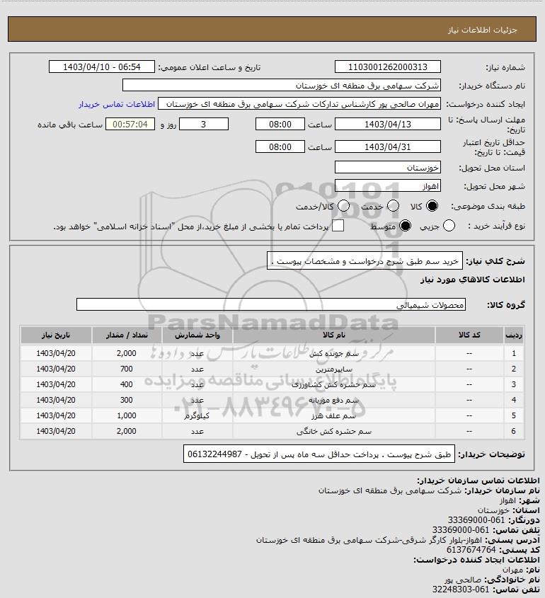 شرح کلی نیاز: خرید سم طبق شرح درخواست و مشخصات پیوست .