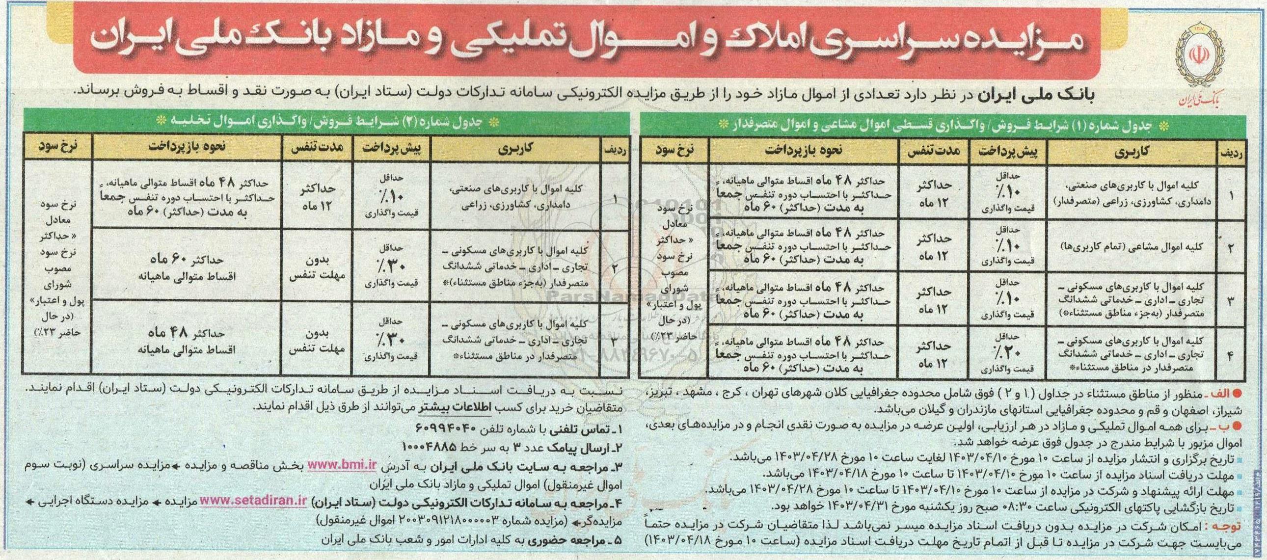 مزایده سراسری املاک و اموال تملیکی و مازاد بانک ملی ایران