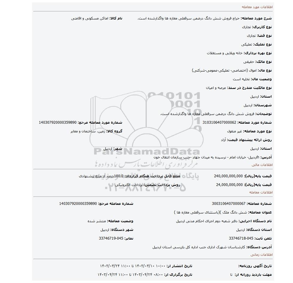 قیمت پایه(ریال): 24,000,000,000 | روش پرداخت تضمین: پرداخت الکترونیکی |