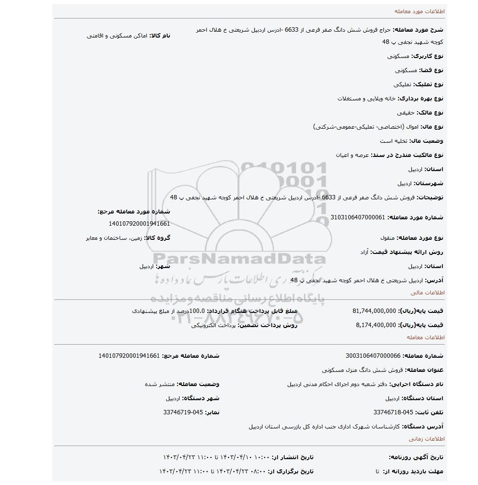 شرح مورد معامله: حراج فروش شش دانگ صفر فرعی از 6633 -ادرس اردبیل شریعتی خ هلال احمر کوچه شهید نجفی پ 48 | نام کالا: اماکن مسکونی و اقامتی | |