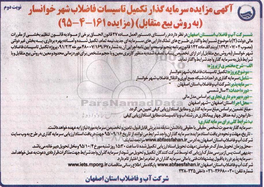 شرکت آب و فاضلاب استان اصفهان در نظر دارد در راستای دستورالعمل ماده 27 قانون الحاق برخی از مواد به قانون تنظیم بخشی از مقررات مالی دولت 2 با موضوع شرایط واگذاری طرح های تملک دارایی های سرمایه ای جدید نیمه تمام ، تکمیل شده و آماده بهره برداری ، به بخش غیردولتی مصوب 1394.7.4 و بند الف ماده 142 قابنون برنامه پنجم توسعه و آیین نامه اجرایی آن به شماره 48007/169/67 مورخه 91.2.3 ، پروژه تکمیل تاسیسات فاضلاب شهر خوانسار (به روش بیع متقابل ) را در ازای تخصیص پساب تصفیه شده به منظور کاربری معین با حجم مشخص برای دوره زمانی محدود و معین به روش بیع متقابل و با شرایط ذیل به سرمایه گذار واجد شرایط واگذار نماید .