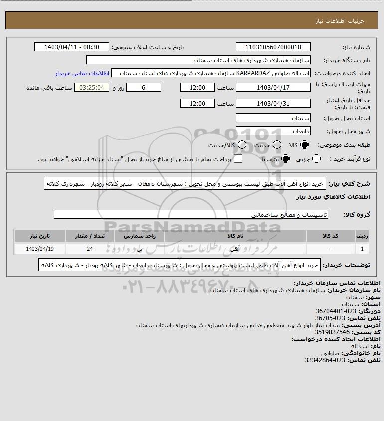 توضیحات خریدار:خرید انواع آهن آلات طبق لیست پیوستی و محل تحویل : شهرستان دامغان - شهر کلاته رودبار - شهرداری کلاته