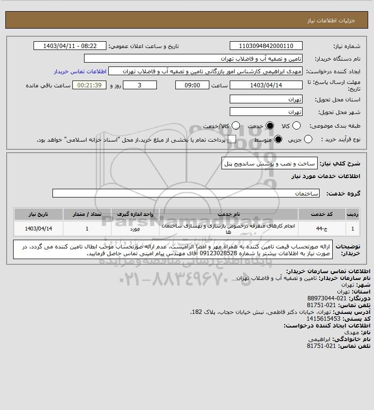 شرح کلی نیاز: ساخت و نصب و پوشش ساندویج پنل