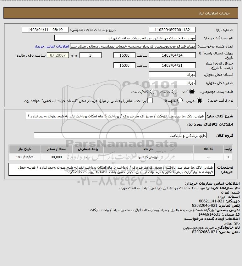 نام دستگاه خریدار:موسسه خدمات بهداشتی درمانی میلاد سلامت تهران
