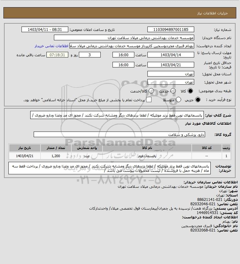 شرح کلی نیاز: پانسمانهای نوین فقط برند مونلیکه / لطفا برندهای دیگر ومشابه شرکت نکنند / مجوز ای مد وغذا ودارو ضروری /