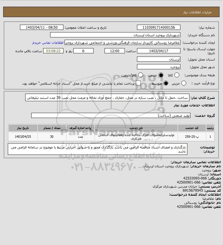 شرح کلی نیاز: ساخت ،حمل تا محل ، نصب سازه در محل، حفاری ، جمع آوری نخاله و مرمت محل نصب 30 عدد استند تبلیغاتی