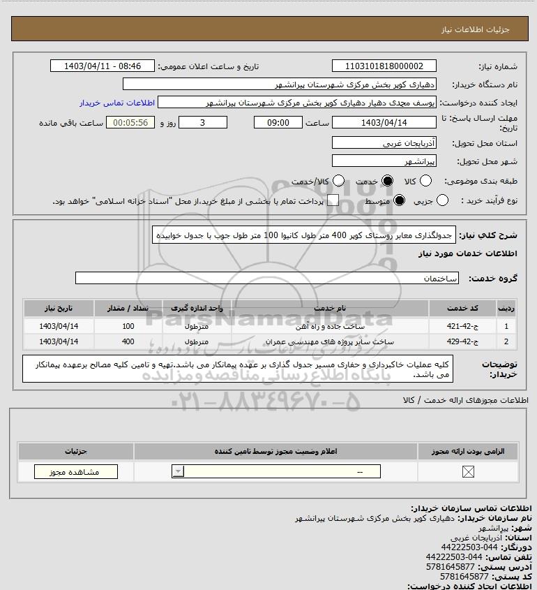 شرح کلی نیاز: جدولگذاری معابر روستای کوپر 400 متر طول کانیوا 100 متر طول جوب با جدول خوابیده
