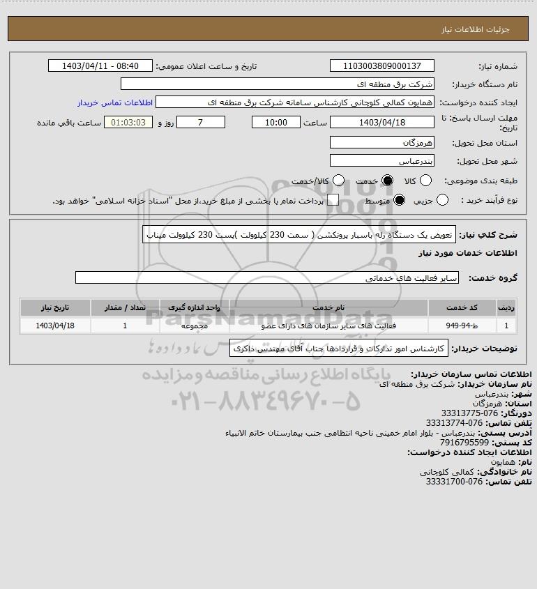 شرح کلی نیاز: تعویض یک دستگاه رله باسبار پروتکشن ( سمت 230 کیلوولت )پست 230 کیلوولت میناب