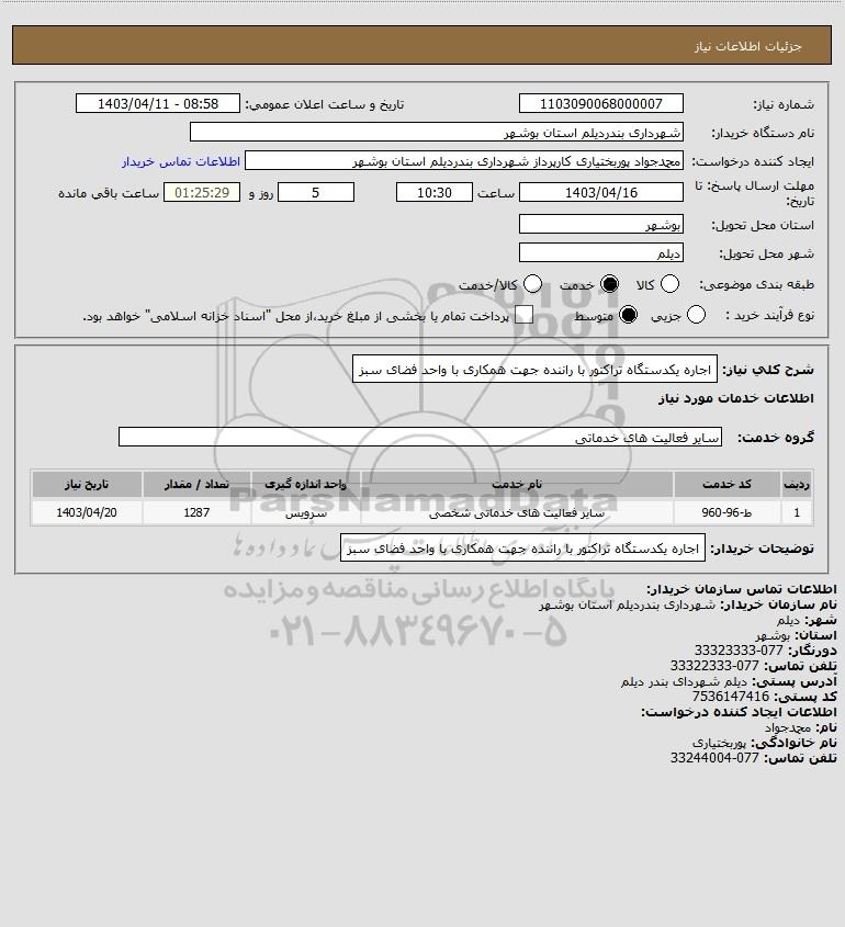 توضیحات خریدار:اجاره یکدستگاه تراکتور با راننده جهت همکاری با واحد فضای سبز