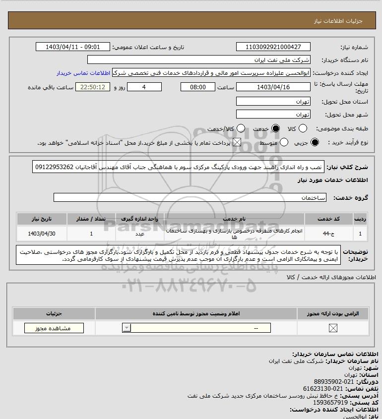 شرح کلی نیاز: نصب و راه اندازی راهبند جهت ورودی پارکینگ مرکزی سوم با هماهنگی جناب آقای مهندس آقاجانیان 09122953262