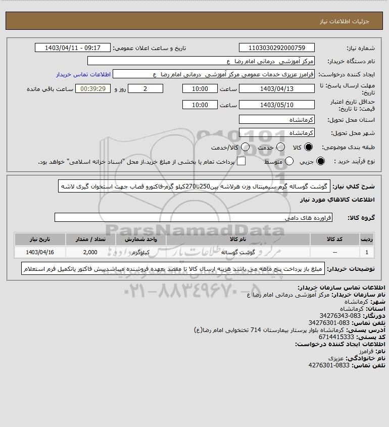 | 1 | -- | گوشت گوساله | کیلوگرم | 2,000 | 1403/04/16 |