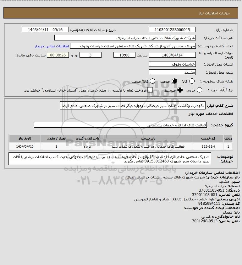 شرح کلی نیاز: نگهداری وکاشت فضای سبز درختکاری وموارد دیگر فضای سبز در شهرک صنعتی خادم الرضا