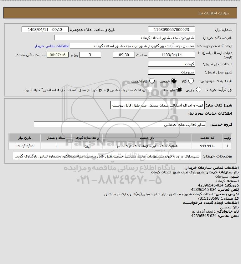 شرح کلی نیاز: تهیه و اجرای آسفالت میدان مسکن مهر طبق فایل پیوست
