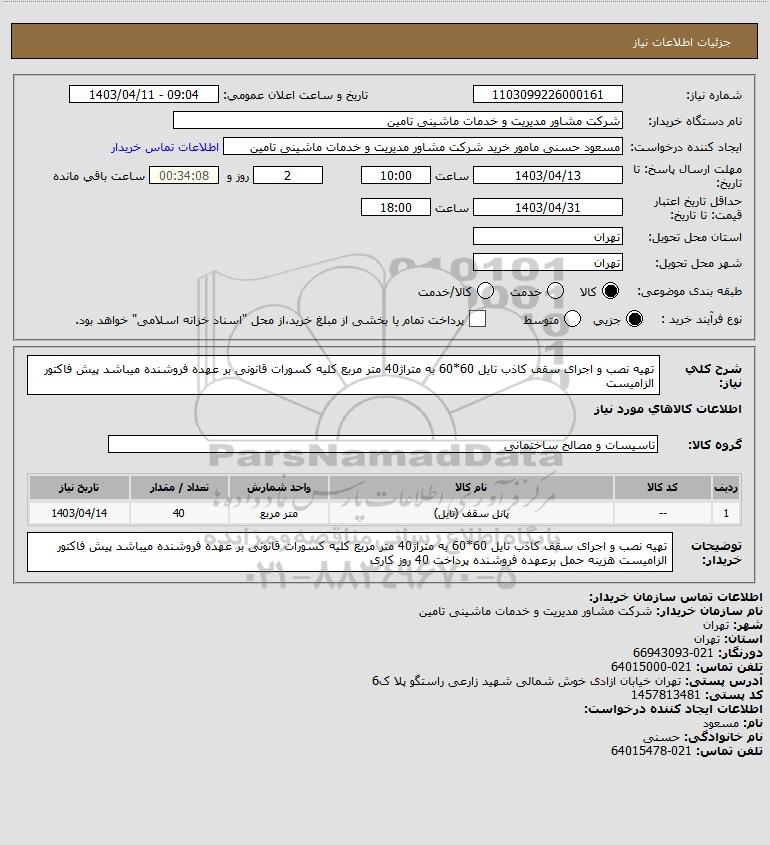شرح کلی نیاز: تهیه نصب و اجرای سقف کاذب تایل 60*60 به متراژ40 متر مربع کلیه کسورات قانونی بر عهده فروشنده میباشد پیش فاکتور الزامیست