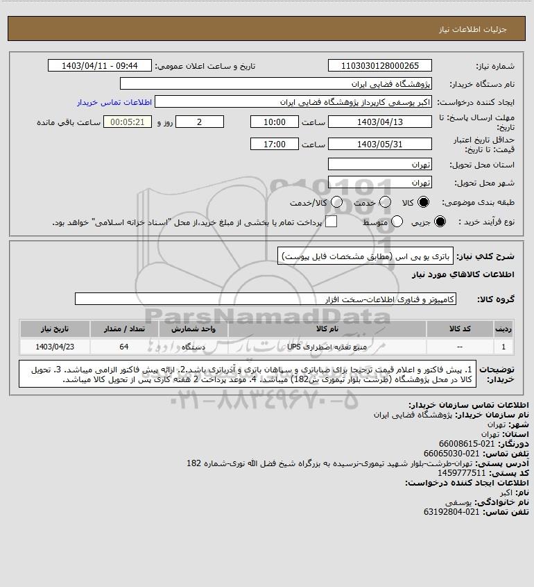 شرح کلی نیاز: باتری یو پی اس (مطابق مشخصات فایل پیوست)