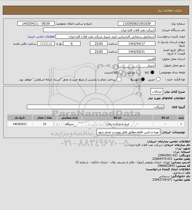| 1 | -- | دریل شارژی یا برقی | دستگاه | 23 | 1403/04/31 |