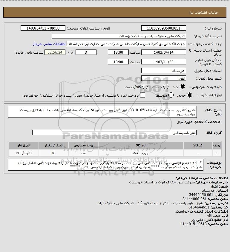 استعلام شرح کالاچوب سخت شماره تقاضا0310105 طبق فایل پیوست . توجه: ایران کد مشابه می باشد حتما به فایل پیوست مراجعه شود., استعلام شرح کالاچوب سخت شماره تقاضا0310105 طبق فایل پیوست . توجه: ایران کد مشابه می باشد حتما به فایل پیوست مراجعه شود.