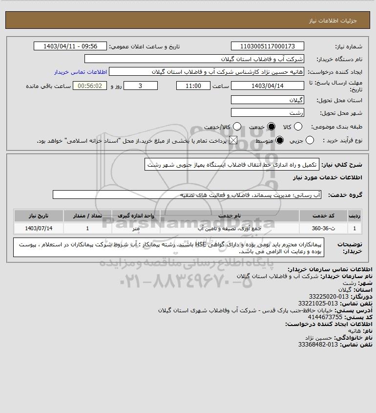 شرح کلی نیاز: تکمیل و راه اندازی خط انتقال فاضلاب ایستگاه پمپاژ جنوبی شهر رشت