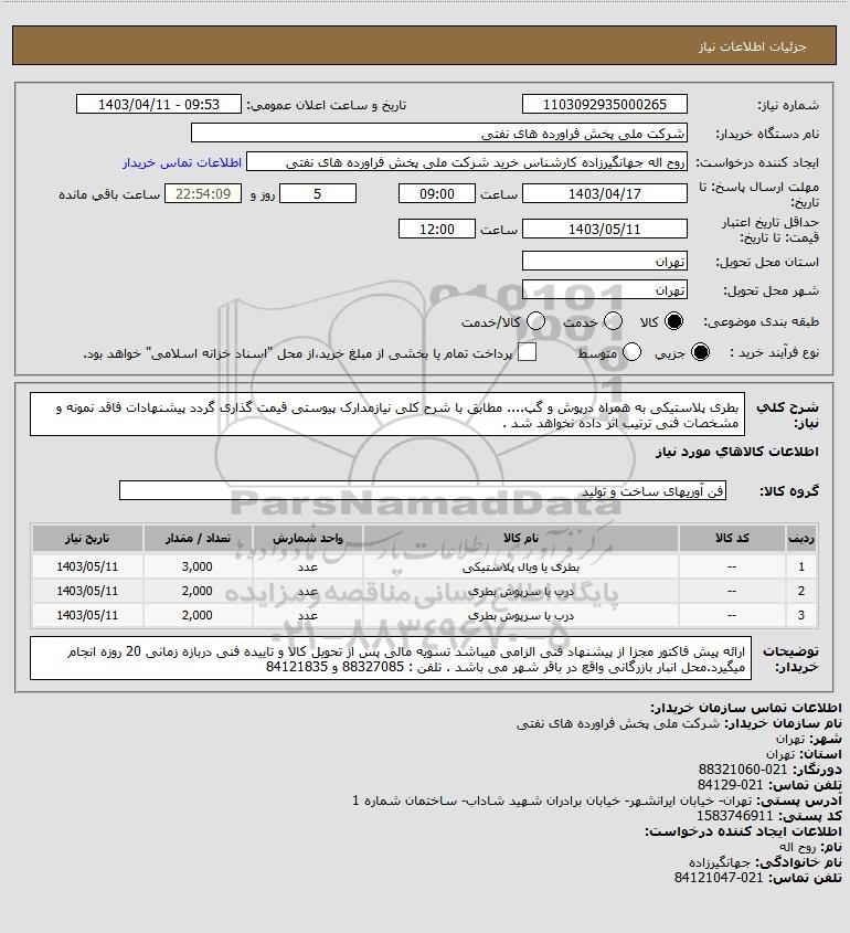 شرح کلی نیاز: بطری پلاستیکی به همراه درپوش و گپ.... مطابق با شرح کلی نیازمدارک پیوستی قیمت گذاری گردد پیشنهادات فاقد نمونه و مشخصات فنی ترتیب اثر داده نخواهد شد .