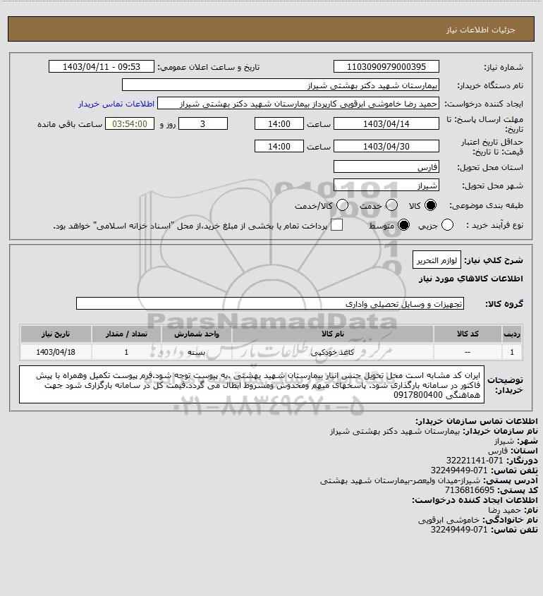 نام سازمان خریدار: بیمارستان شهید دکتر بهشتی شیراز