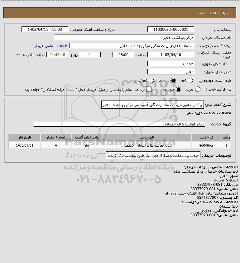 شرح کلی نیاز: واگذاری امور خرید خدمات رانندگی آمبولانس مرکز بهداشت ملایر