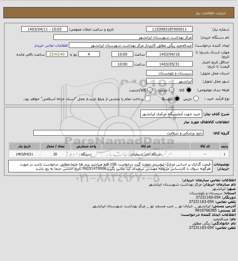 نام دستگاه خریدار:مرکز بهداشت شهرستان ایرانشهر