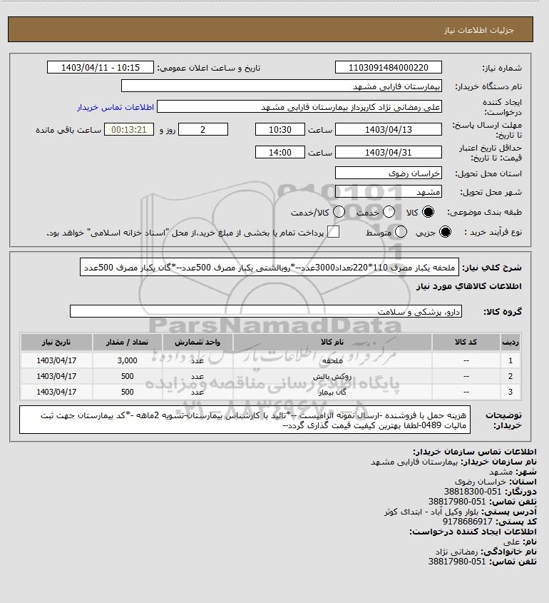 استعلام ملحفه یکبار مصرف 110*220تعداد3000عدد--*روبالشتی یکبار مصرف 500عدد--*گان یکبار مصرف 500عدد, استعلام ملحفه یکبار مصرف 110*220تعداد3000عدد--*روبالشتی یکبار مصرف 500عدد--*گان یکبار مصرف 500عدد
