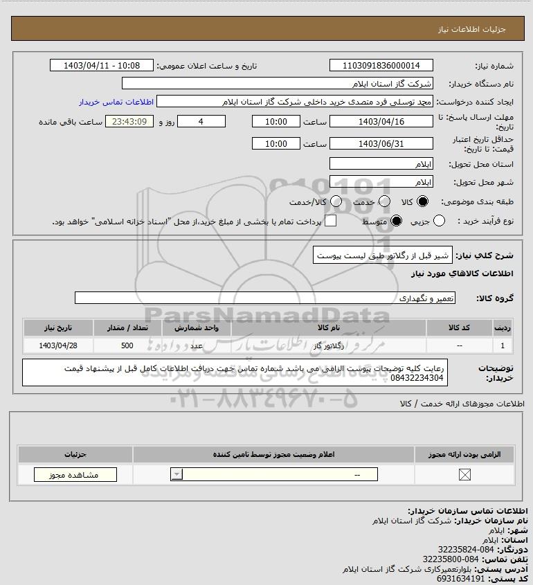 | 1 | -- | رگلاتور گاز | عدد | 500 | 1403/04/28 |