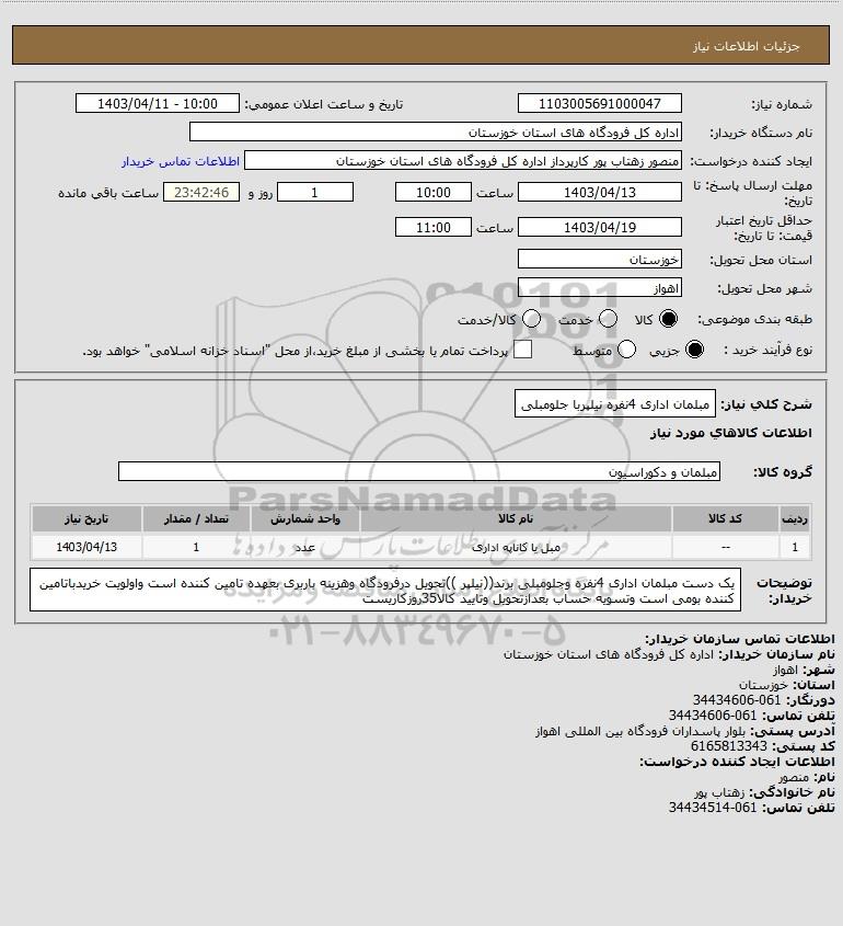 شرح کلی نیاز: مبلمان اداری 4نفره نیلپربا جلومبلی