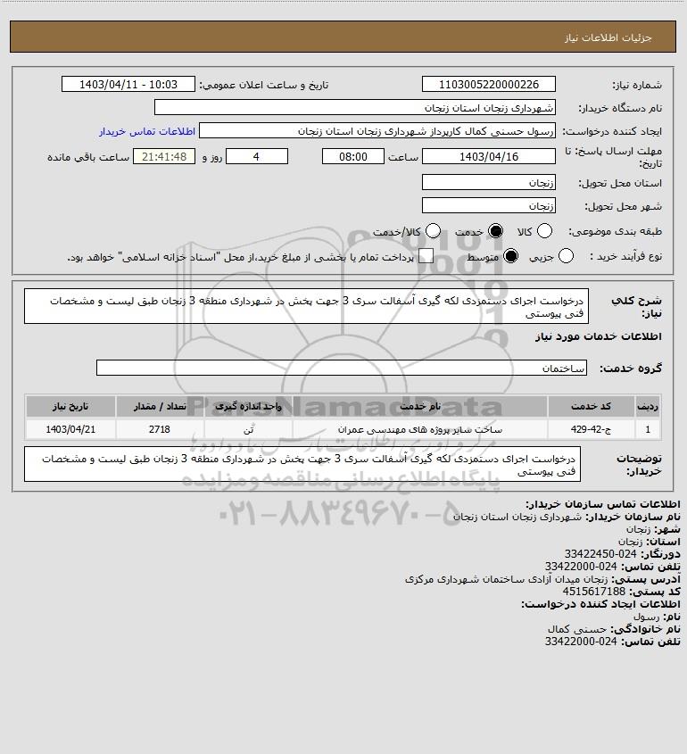 شرح کلی نیاز: درخواست اجرای دستمزدی لکه گیری آسفالت سری 3 جهت پخش در شهرداری منطقه 3 زنجان طبق لیست و مشخصات فنی پیوستی