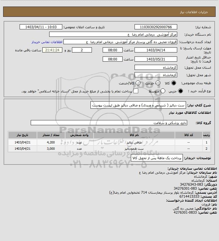 شرح کلی نیاز: ست دیالیز ( شریانی و وریدی) و صافی دیالیز طبق لیست پیوست