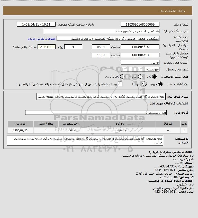 شرح کلی نیاز: لوله واتصالات گاز طبق پیوست فاکتور به ریز پیوست گردد لطفا توضیحات پیوست به دقت مطاله نمایید