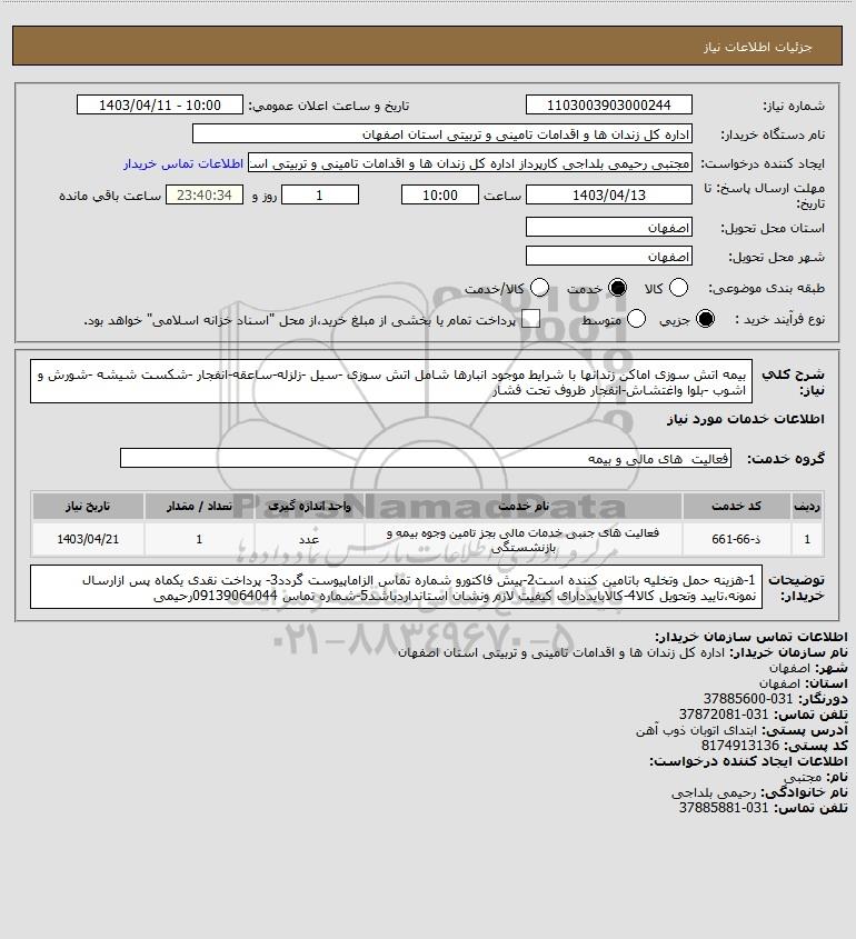 شرح کلی نیاز: بیمه اتش سوزی اماکن زندانها با شرایط موجود انبارها شامل اتش سوزی -سیل -زلزله-ساعقه-انفجار -شکست شیشه -شورش و اشوب -بلوا واغتشاش-انفجار ظروف تحت فشار