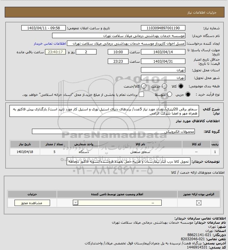 شرح کلی نیاز: سماور برقی 20لیتری/ تعداد مورد نیاز 5عدد/ برندهای دنیای استیل نوری و استیل کار مورد تایید است/ بارگذاری پیش فاکتور به همراه مهر و امضا شرکت الزامی