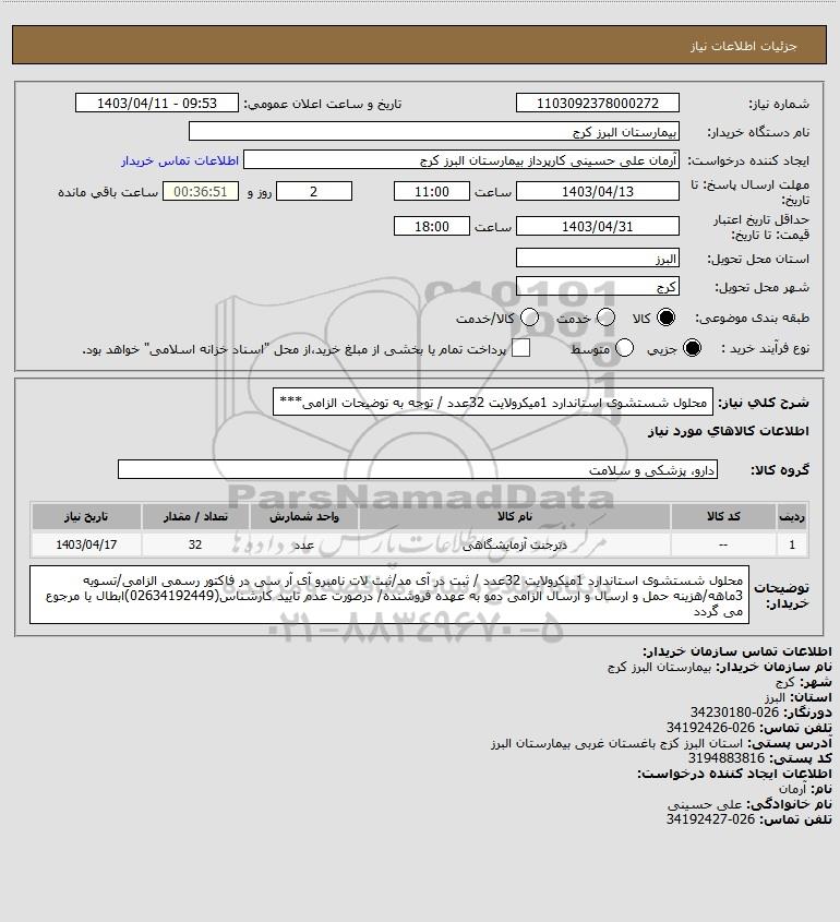 شرح کلی نیاز: محلول شستشوی استاندارد 1میکرولایت 32عدد / توجه به توضیحات الزامی***