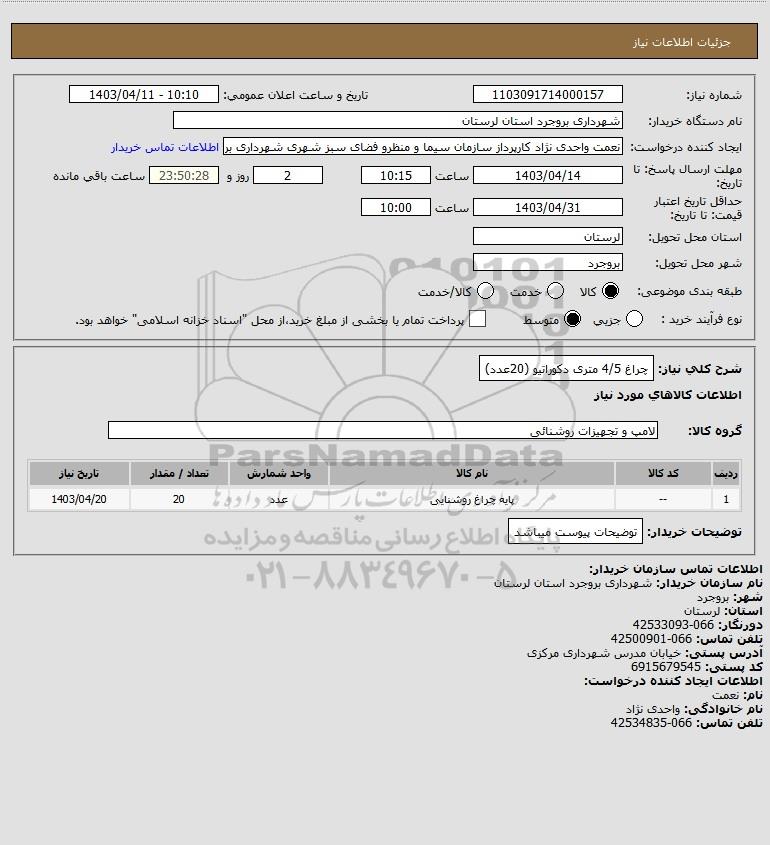 استعلام چراغ 4/5 متری دکوراتیو (20عدد), استعلام چراغ 4/5 متری دکوراتیو (20عدد)