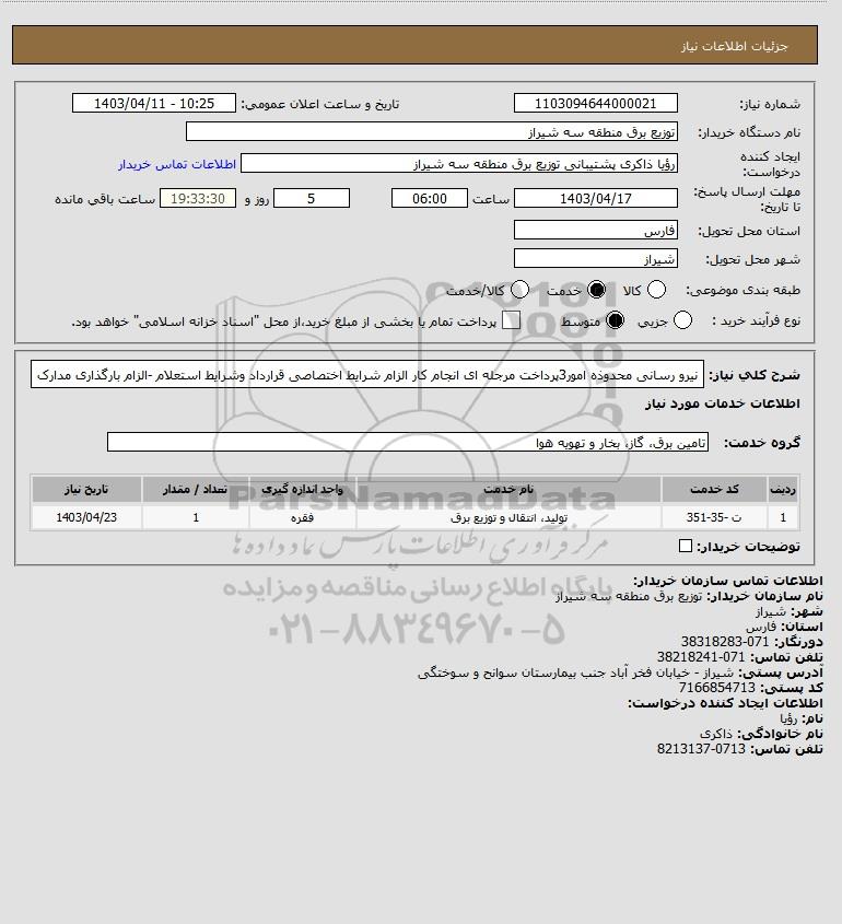 شرح کلی نیاز: نیرو رسانی محدوذه امور3پرداخت مرجله ای انجام کار الزام شرایط اختصاصی قرارداد وشرایط استعلام -الزام بارگذاری مدارک