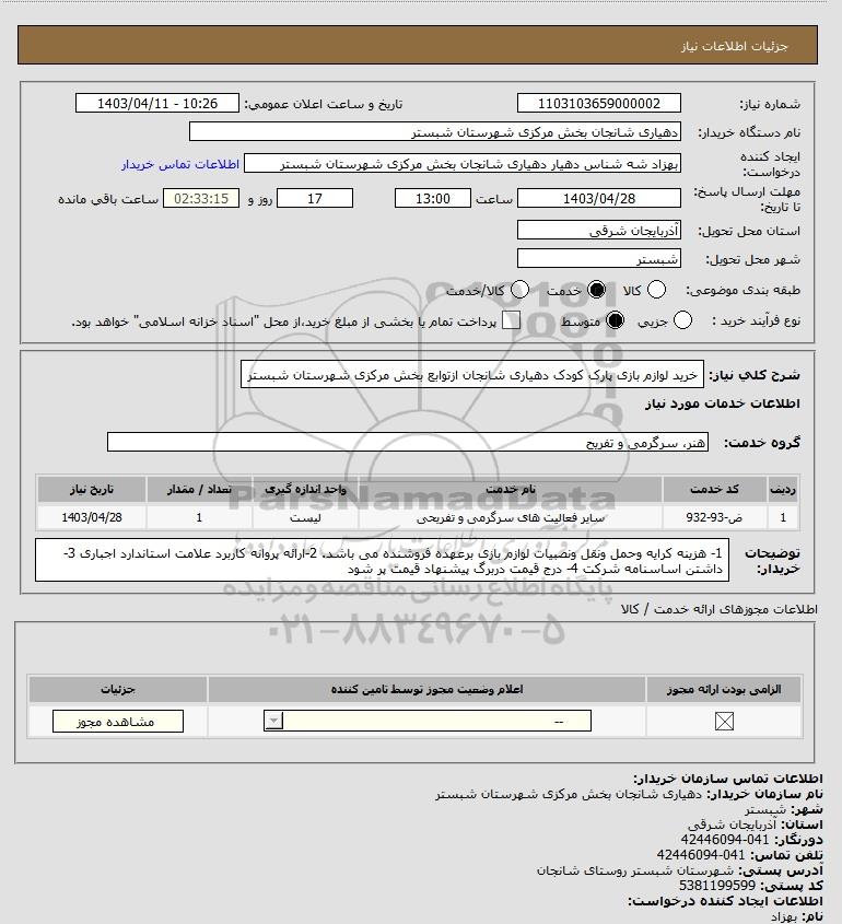 شرح کلی نیاز: خرید لوازم بازی پارک کودک دهیاری شانجان ازتوابع بخش مرکزی شهرستان شبستر