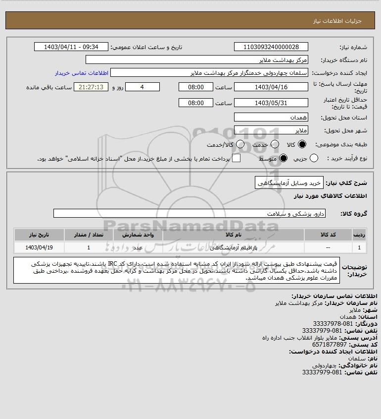 نام دستگاه خریدار:مرکز بهداشت ملایر