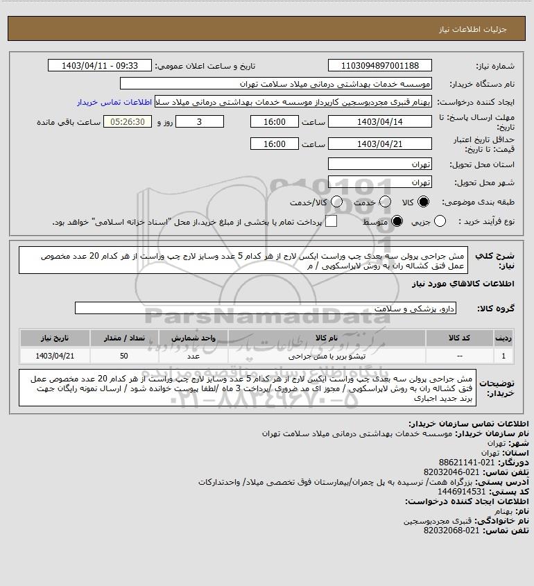 | 1 | -- | تیشو بریر یا مش جراحی | عدد | 50 | 1403/04/21 |