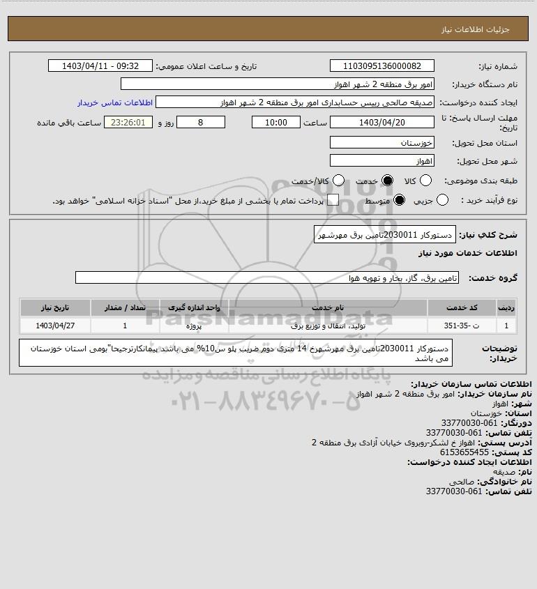 شرح کلی نیاز: دستورکار 2030011تامین برق مهرشهر
