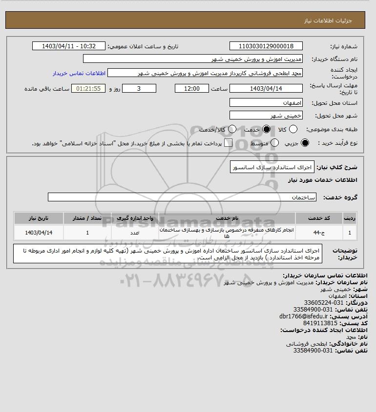 توضیحات خریدار:اجرای استاندارد سازی اسانسور ساختمان اداره اموزش و پرورش خمینی شهر (تهیه کلیه لوازم و انجام امور اداری مربوطه تا مرحله اخذ استاندارد ) بازدید از محل الزامی است.