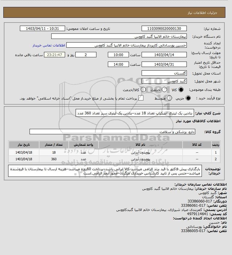 شرح کلی نیاز: بتادین یک لیتری اسکراپ تعداد 18 عدد--بتادین یک لیتری سبز تعداد 360 عدد