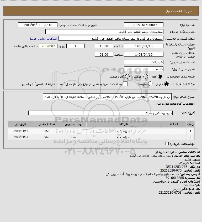 شرح کلی نیاز: نخ نایلون 2/0کات 960عدد نخ نایلون 3/0کات 960عدد /پرداختی 3 ماهه هزینه ارسال با فرستنده