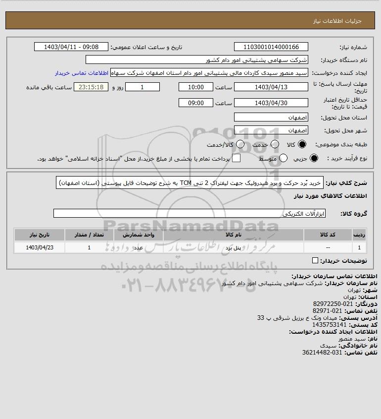 شرح کلی نیاز: خرید بُرد حرکت و برد هیدرولیک جهت لیفتراک 2 تنی TCM به شرح توضیحات فایل پیوستی (استان اصفهان)