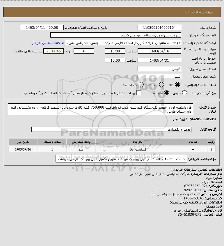 شرح کلی نیاز: قراردادتهیه لوازم وتعمیر یکدستگاه کندانسور تبخیری باظرفیت 750.000 کیلو کالری سردخانه شهید کاظمی زاده پشتیبانی امور دام استان فارس