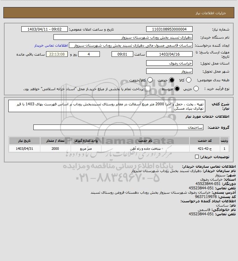 شرح کلی نیاز: تهیه ، پخت ، حمل و اجرا 2000 متر مربع آسفالت در معابر روستای تسبندبخش روداب بر اساس فهرست بهای 1403 با قیر تهاتری بنیاد مسکن