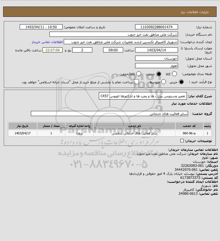 شرح کلی نیاز: تعمیر وسرویس یونیت ها و پمپ ها و انژکتورها اتوبوس C457