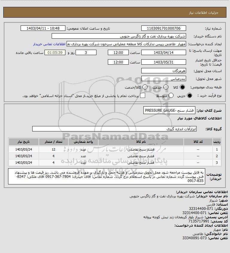 شرح کلی نیاز: فشار سنج -PRESSURE GAUGE